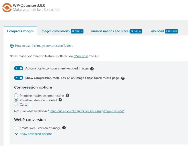 שיפור מהירות האתר מתחיל בשימוש בכלים ייעודיים כמו WP Optimize (עבור אתרי וורדפרס), שמאפשר לדחוס ולהקטין את נפח הקבצים באתר, כולל תמונות וקבצי קוד, כדי להקטין את זמן הטעינה. בנוסף, כלי כמו Tinify (TinyPNG) מתאים במיוחד לדחיסת תמונות באופן שמפחית את משקלן מבלי לפגוע באיכותן, דבר שמשפר משמעותית את ביצועי האתר, במיוחד במובייל.